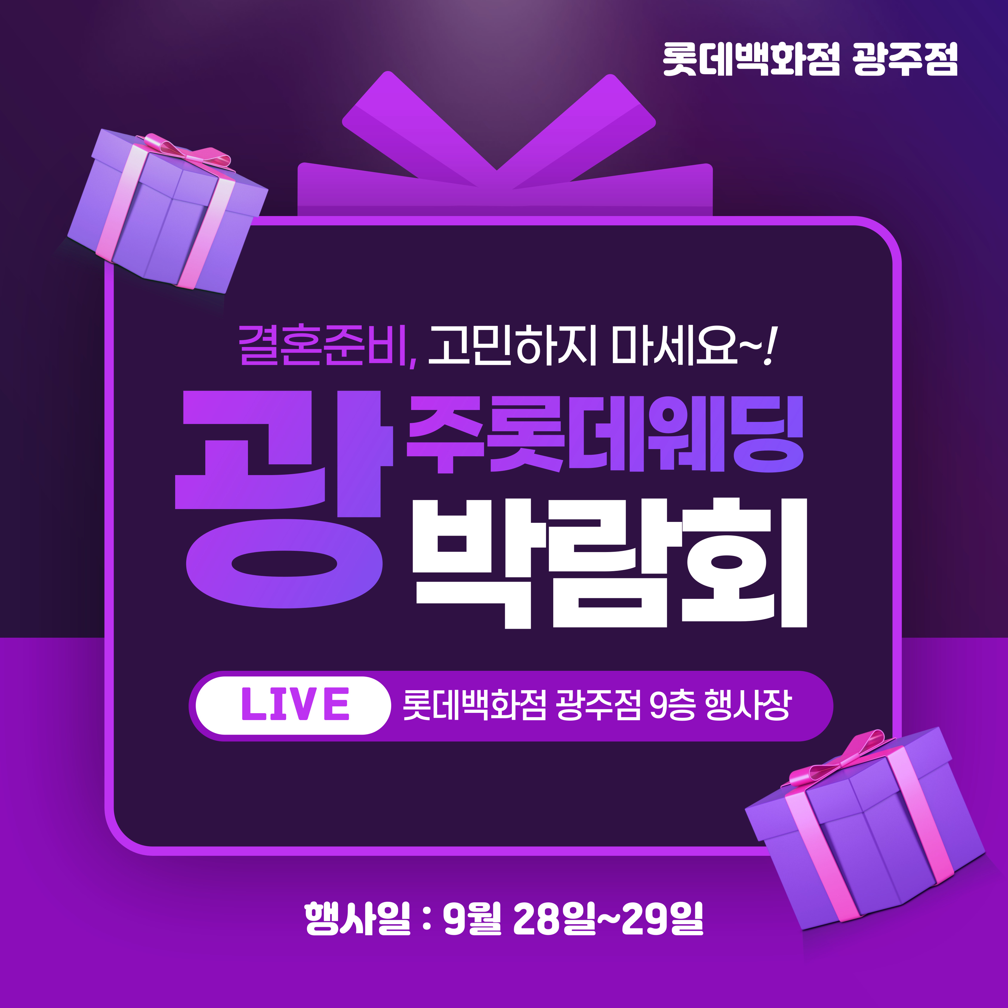 9월28일~29일 단2일간 롯데백화점 광주웨딩박람회 LG전자 스드메초특가 한복,예복,예물, 신혼여행박람회 동시개최